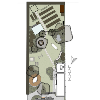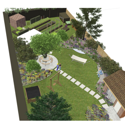 Het ontwerp: Een informele en gezellige sfeer, met veel ruimte voor borders met inheemse en eetbare planten. Voor en midden in de tuin zijn diverse terrassen voor zon (of schaduw) op verschillende momenten van de dag. Achterin de tuin is ruimte gemaakt voor een flinke moestuin.