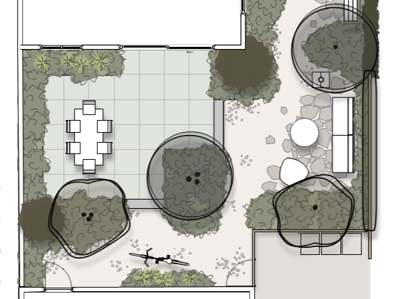 Na een uitbouw aan de gehele achtergevel en het verwijderen van de oude garage achterin de tuin, moest de hele tuin opnieuw ingericht worden. De eigenaren wilden graag veel bloeiende planten en voldoende ruimte om vrienden en familie te kunnen uitnodigen.